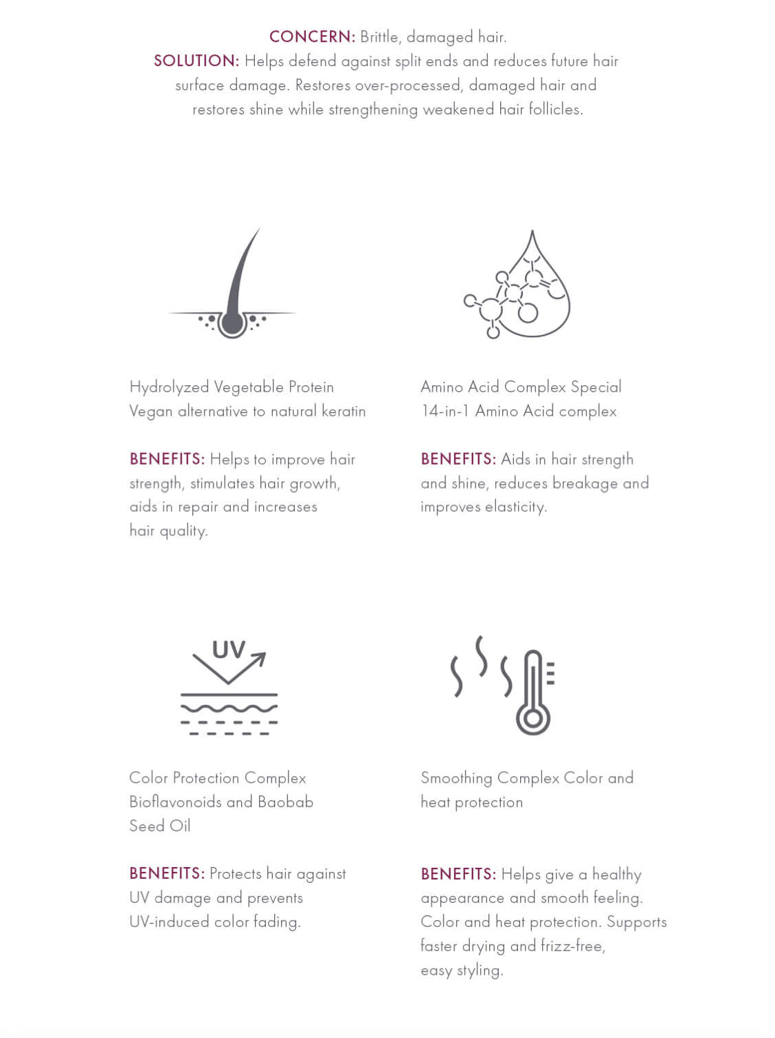 Solution: Helps defend against split ends and reduces future hair surface damage. Restores over-processed, damaged hair and restores shine while strengthening weakened hair follicles.